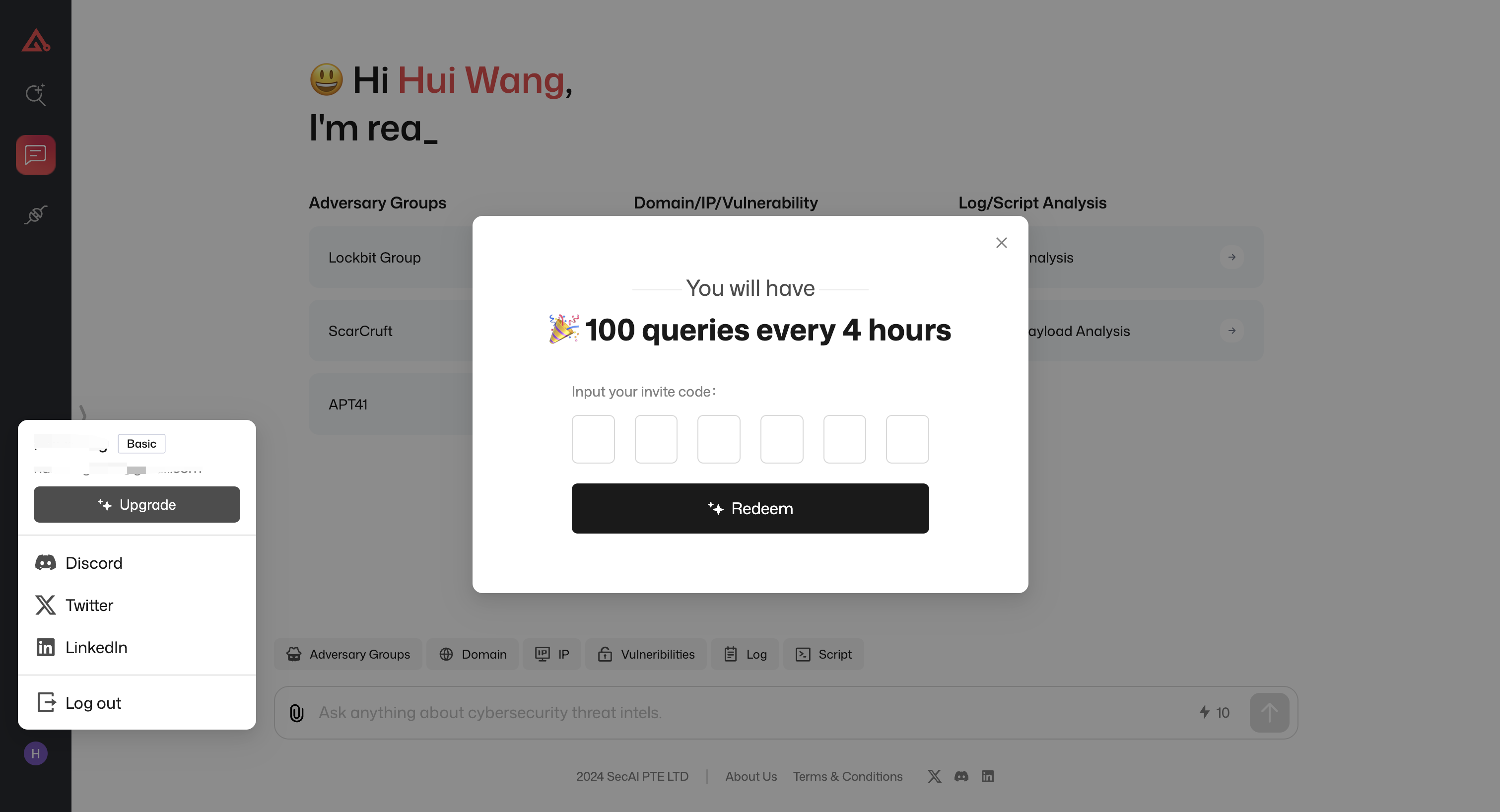 Users who need higher query limits can redeem an invite code to upgrade to a Pro account.