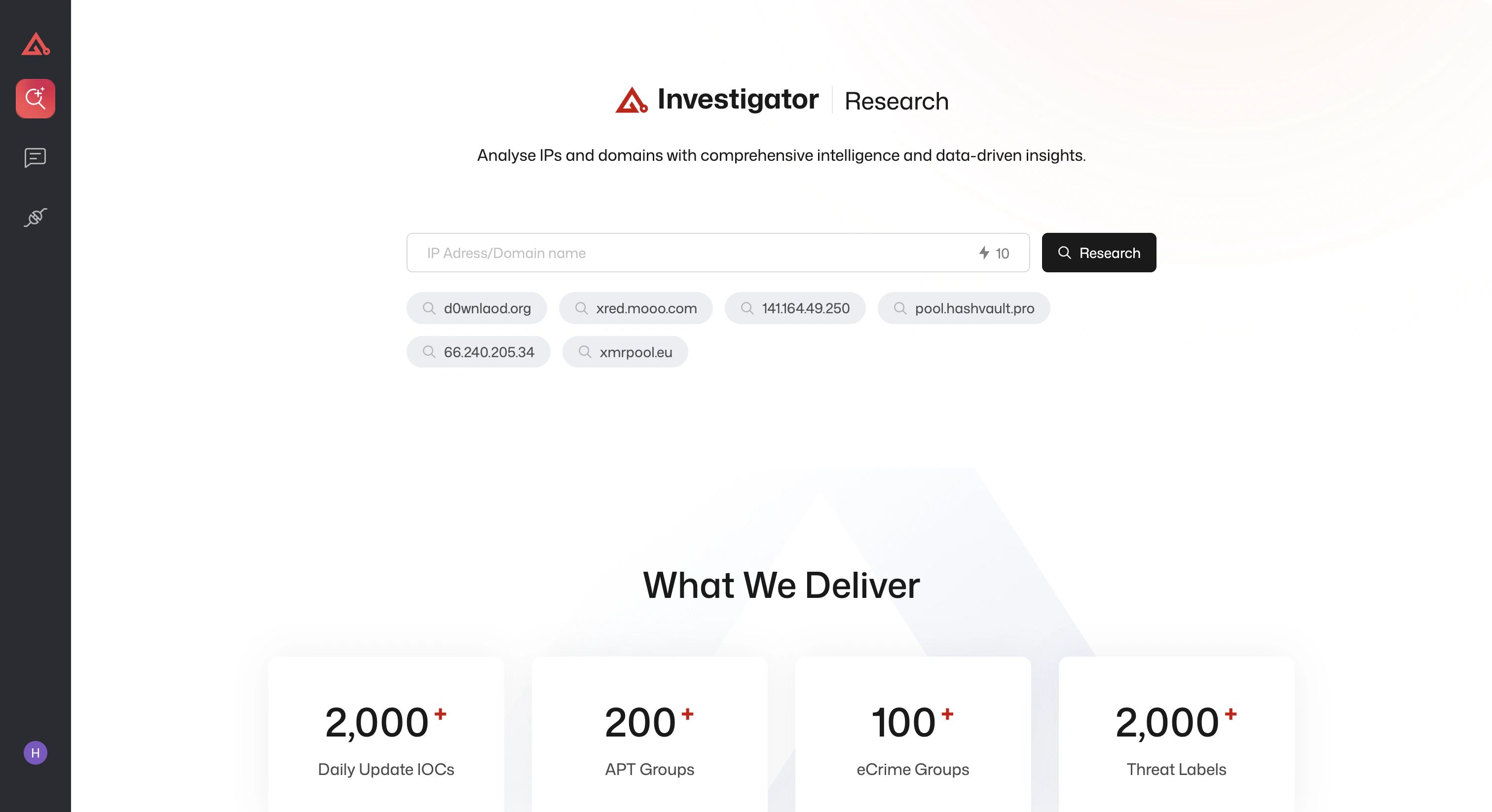 - Feeds (Coming Soon) – Continuous intelligence updates for external integration.