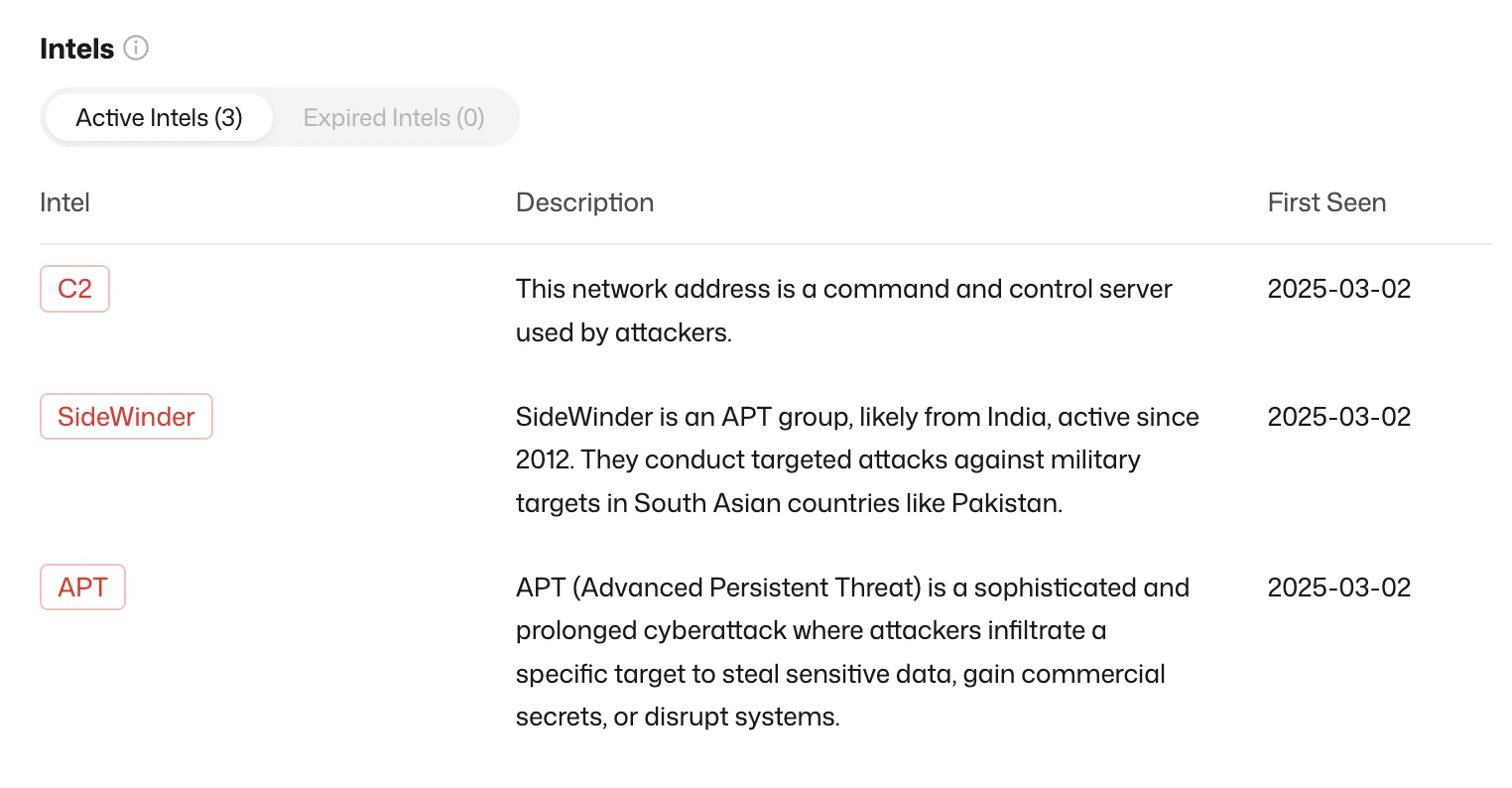 Each IP or domain comes with automated intelligence labels that categorize its risk profile.Including but not limited to the following categories:- Threat Attribution: Identifies links to APT groups, botnets, or malware campaigns.